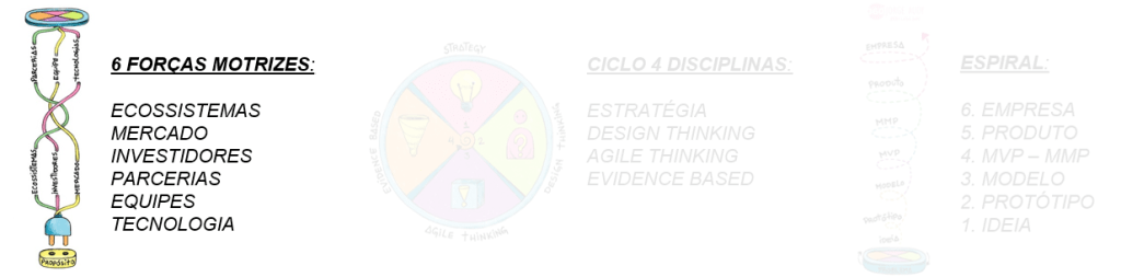 Proponho aqui o modelo “Startup Quest“, uma espiral para soluções inovadoras. É para ser um modelo didático, por isso está organizado da seguinte forma: A esquerda temos 6 (seis) forças motrizes, ao centro um ciclo de 4 (quatro) disciplinas, a direita uma espiral com 7 (sete) etapas evolutivas, passível de Pivots (recomeçar, permitir-se mudar).